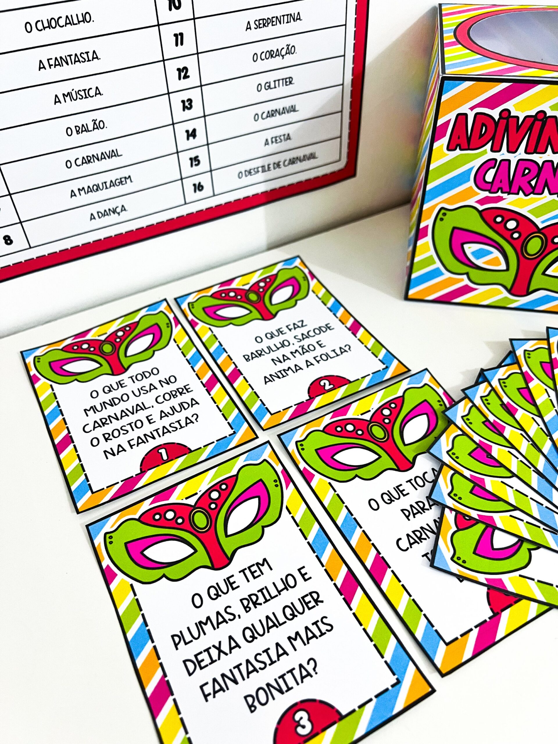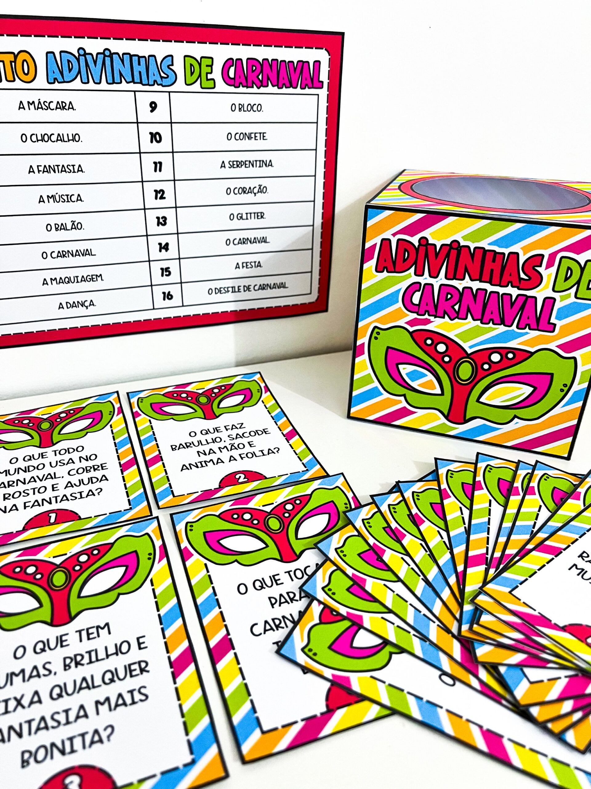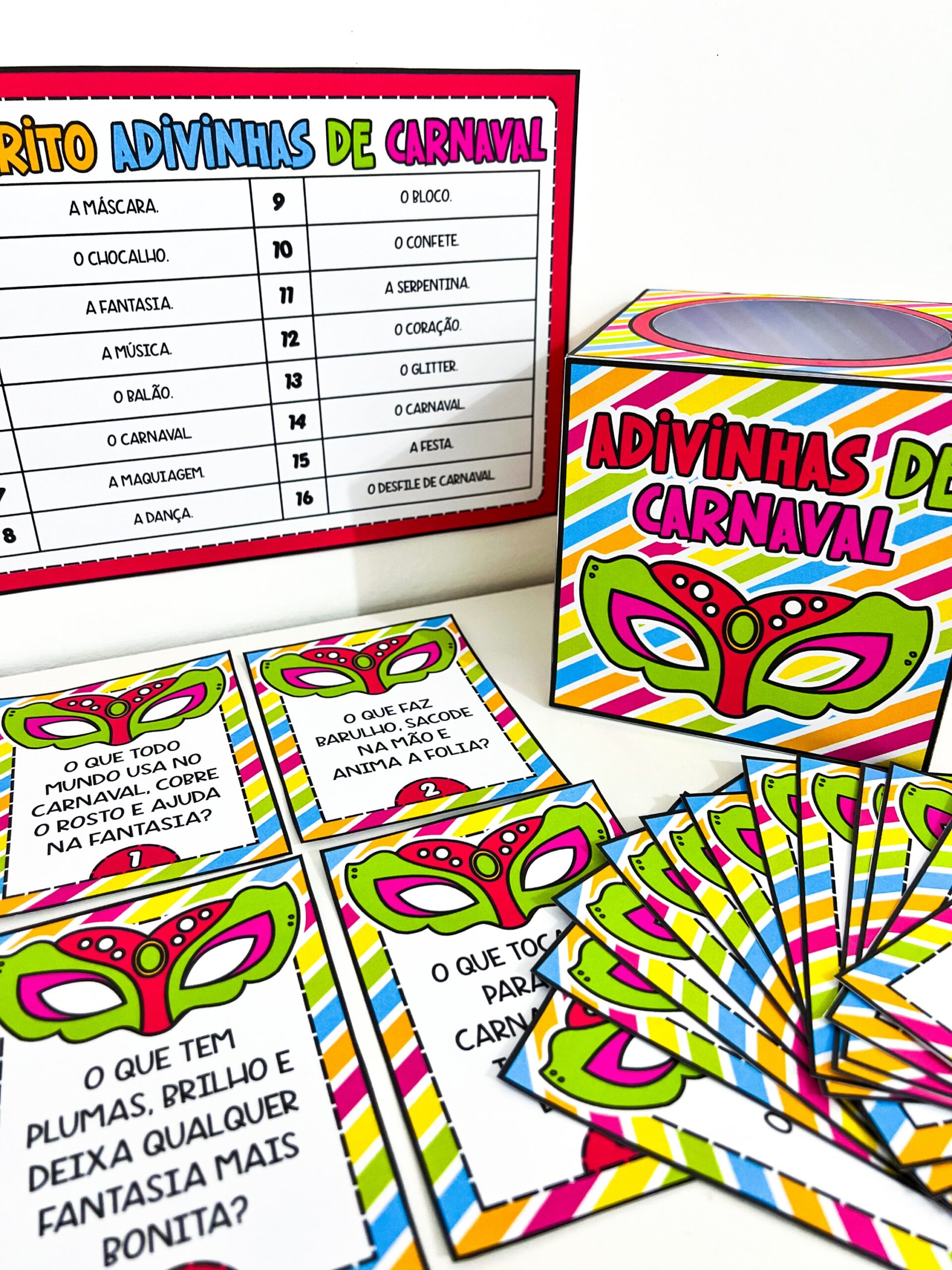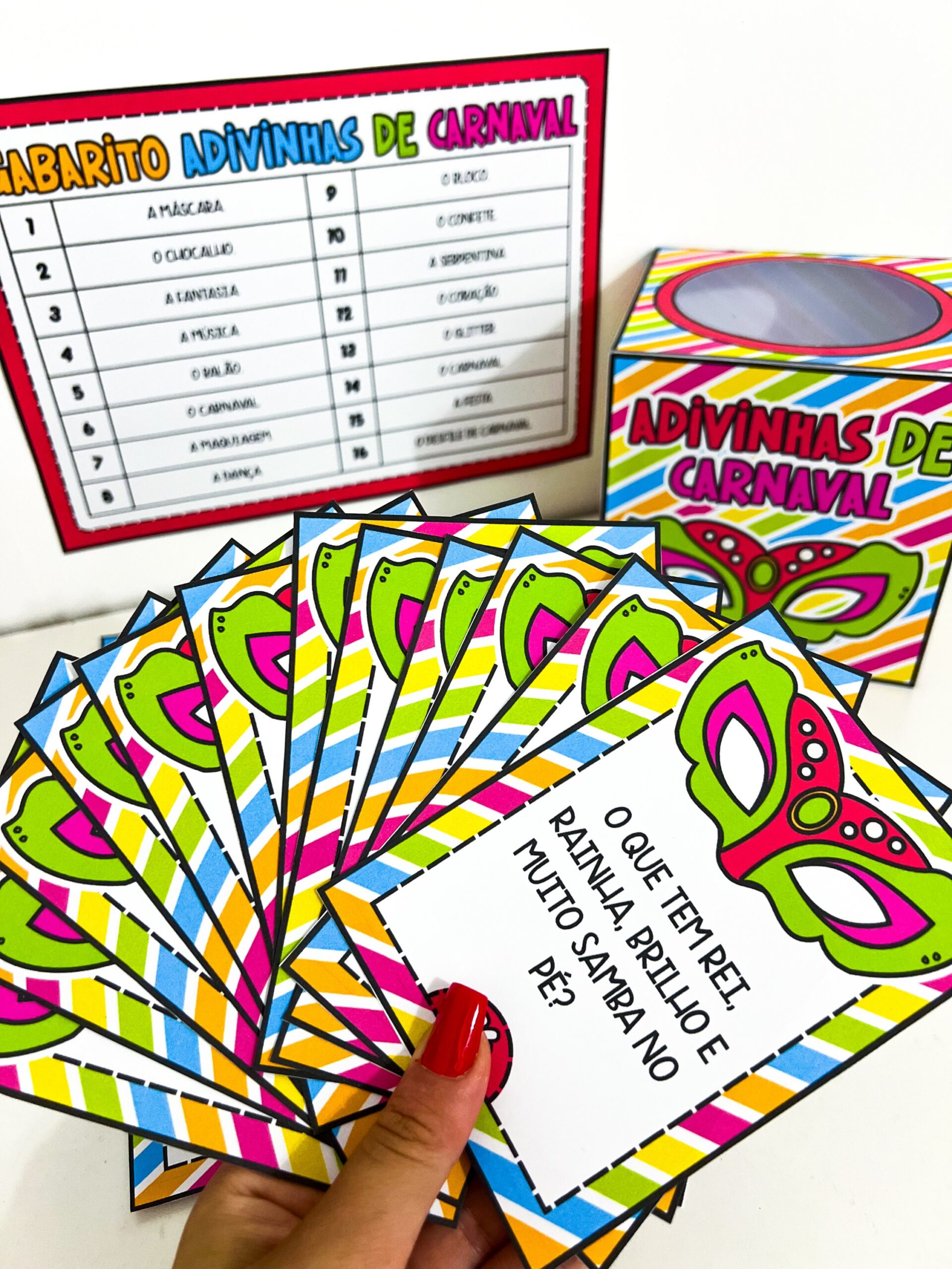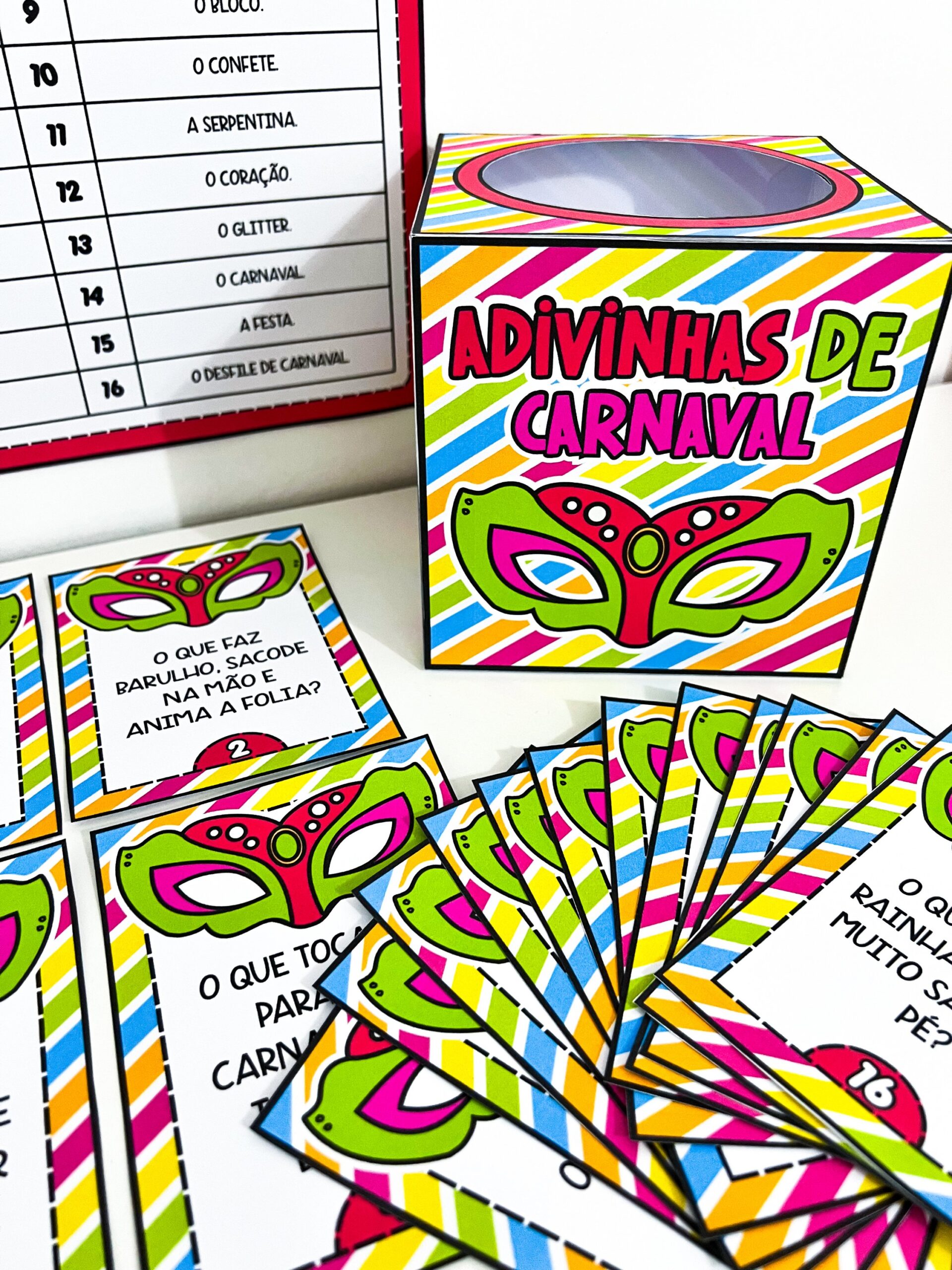 🎉O conjunto contém um molde de caixa para guardar o material, 16 fichas de adivinhas com perguntas relacionadas ao Carnaval e um gabarito para conferência das respostas.