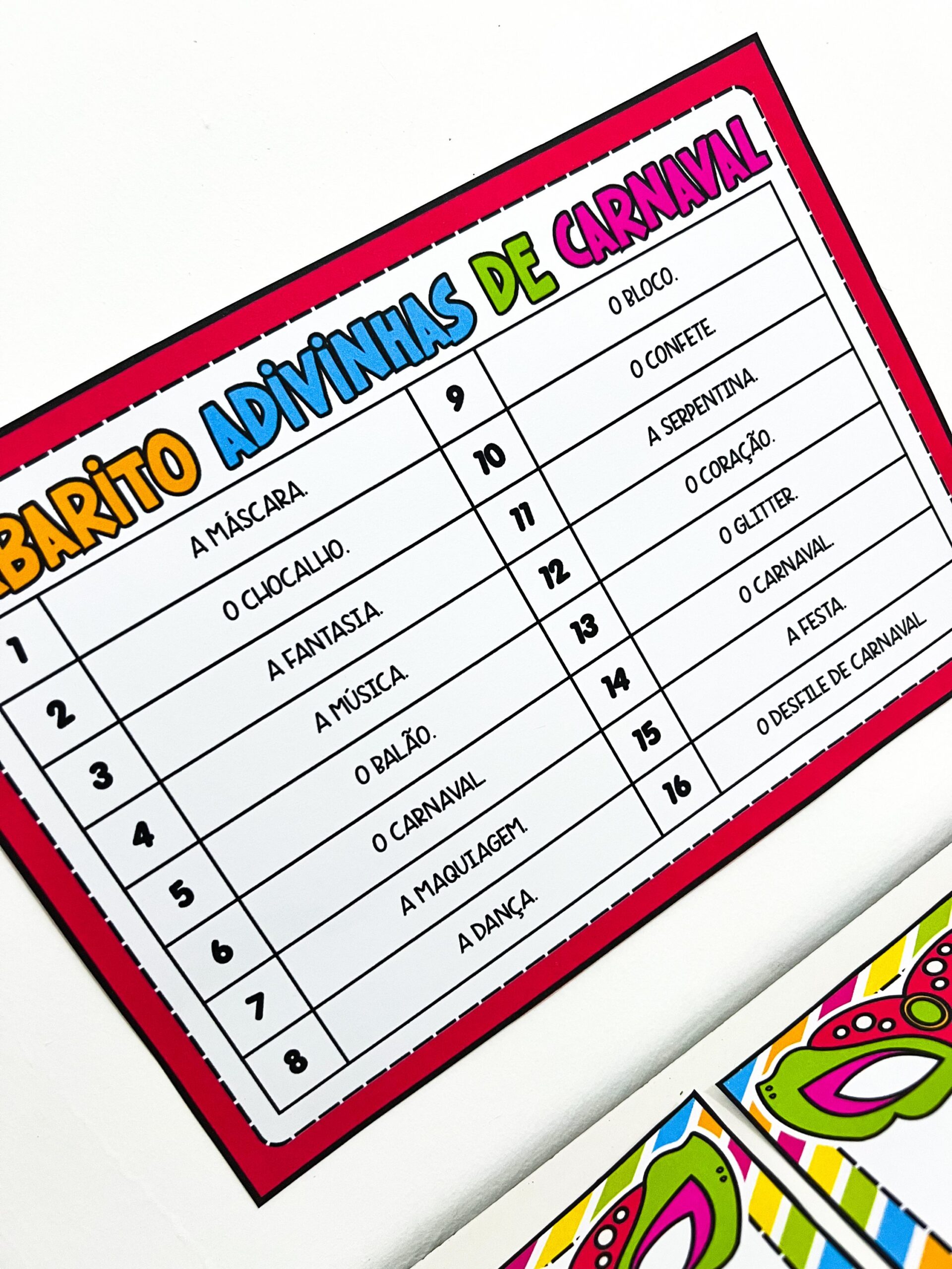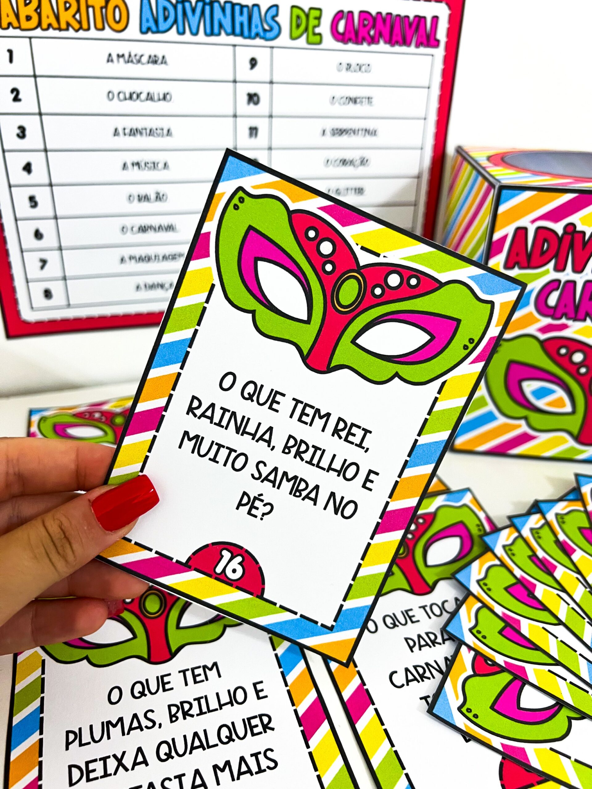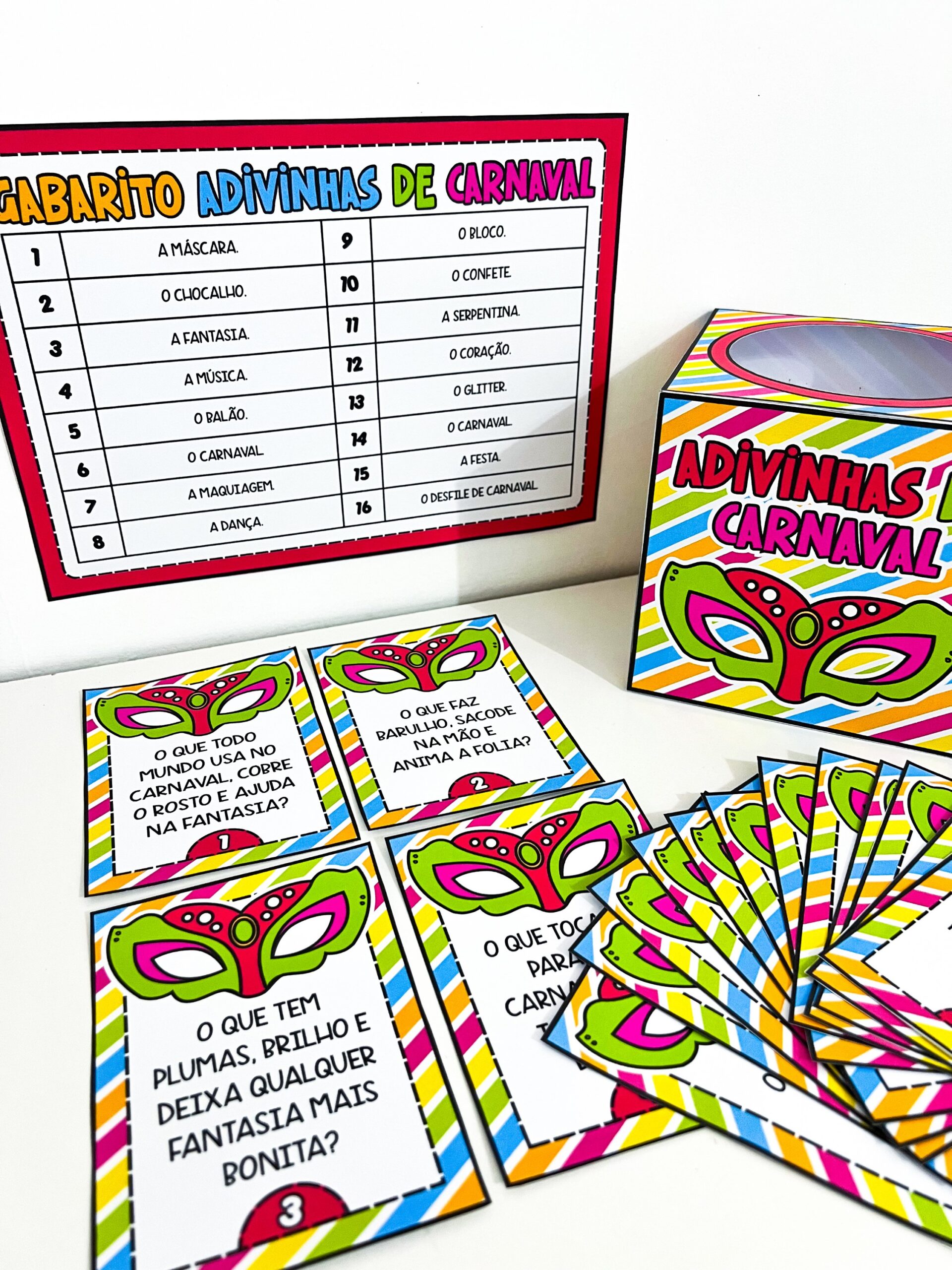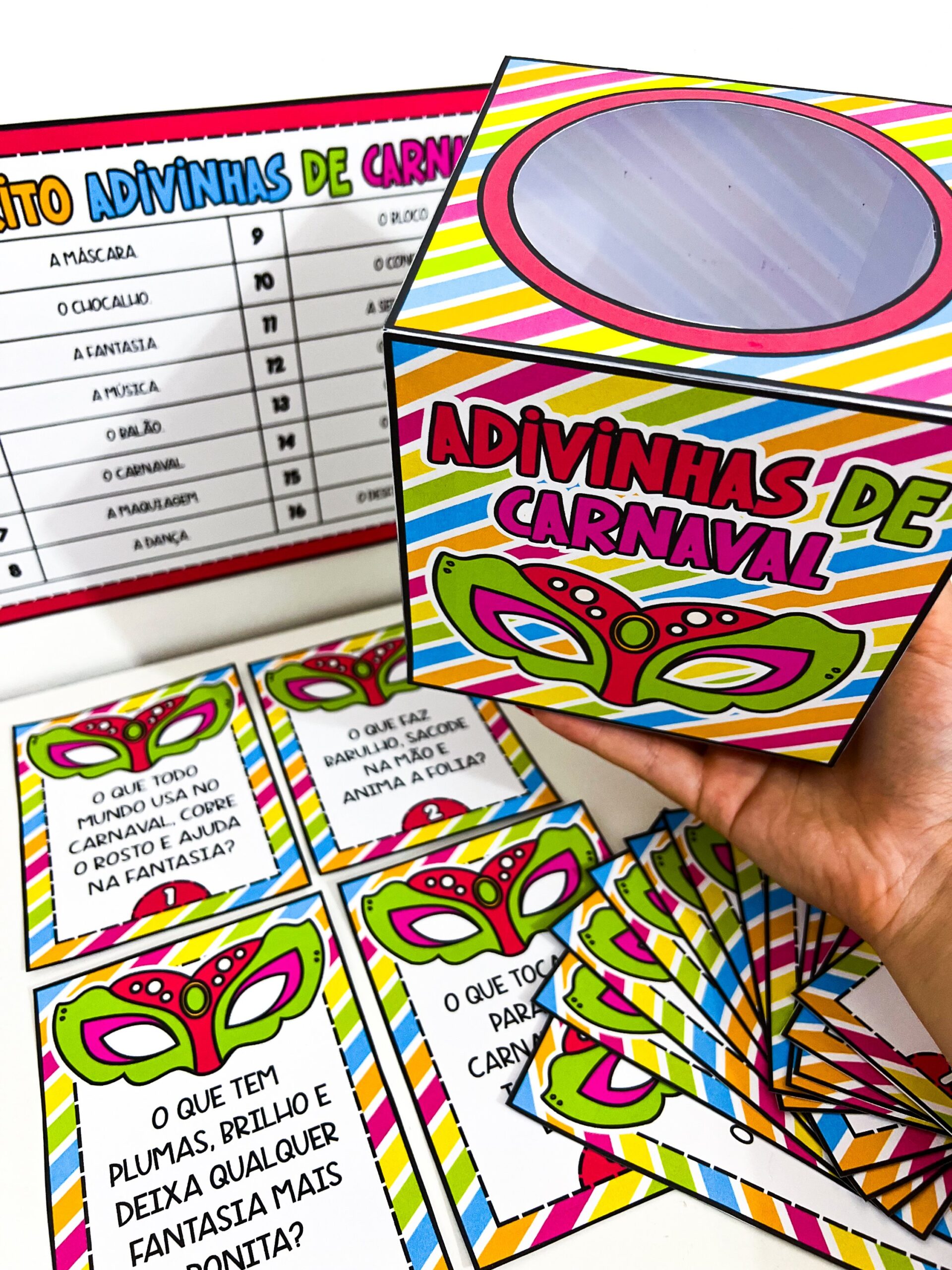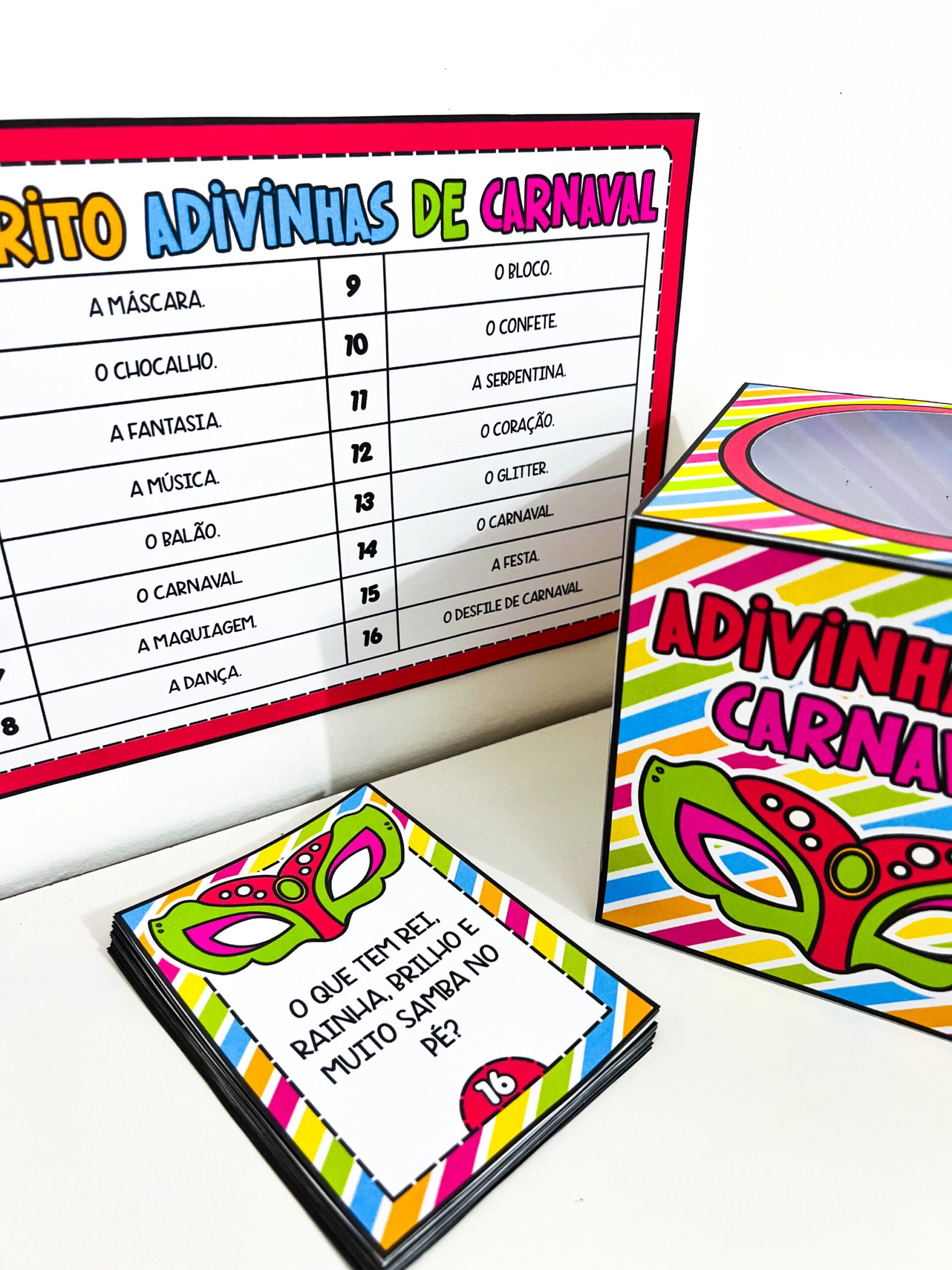 🎉O conjunto contém um molde de caixa para guardar o material, 16 fichas de adivinhas com perguntas relacionadas ao Carnaval e um gabarito para conferência das respostas.