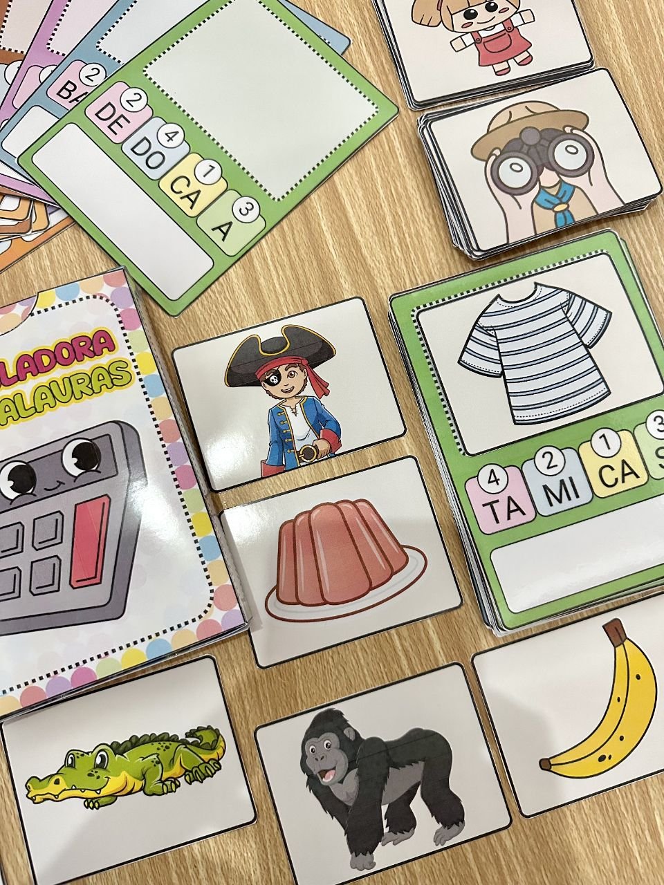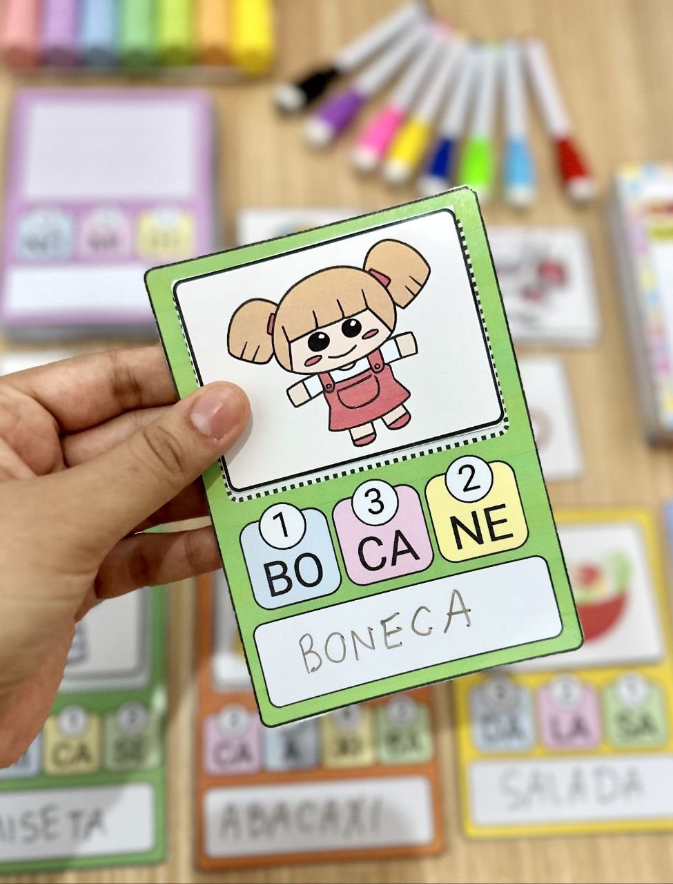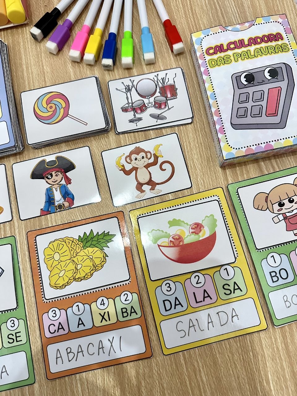 ✅ Com 48 fichas de palavras para a criança organizar as sílabas e descobrir qual figura a palavra representa.