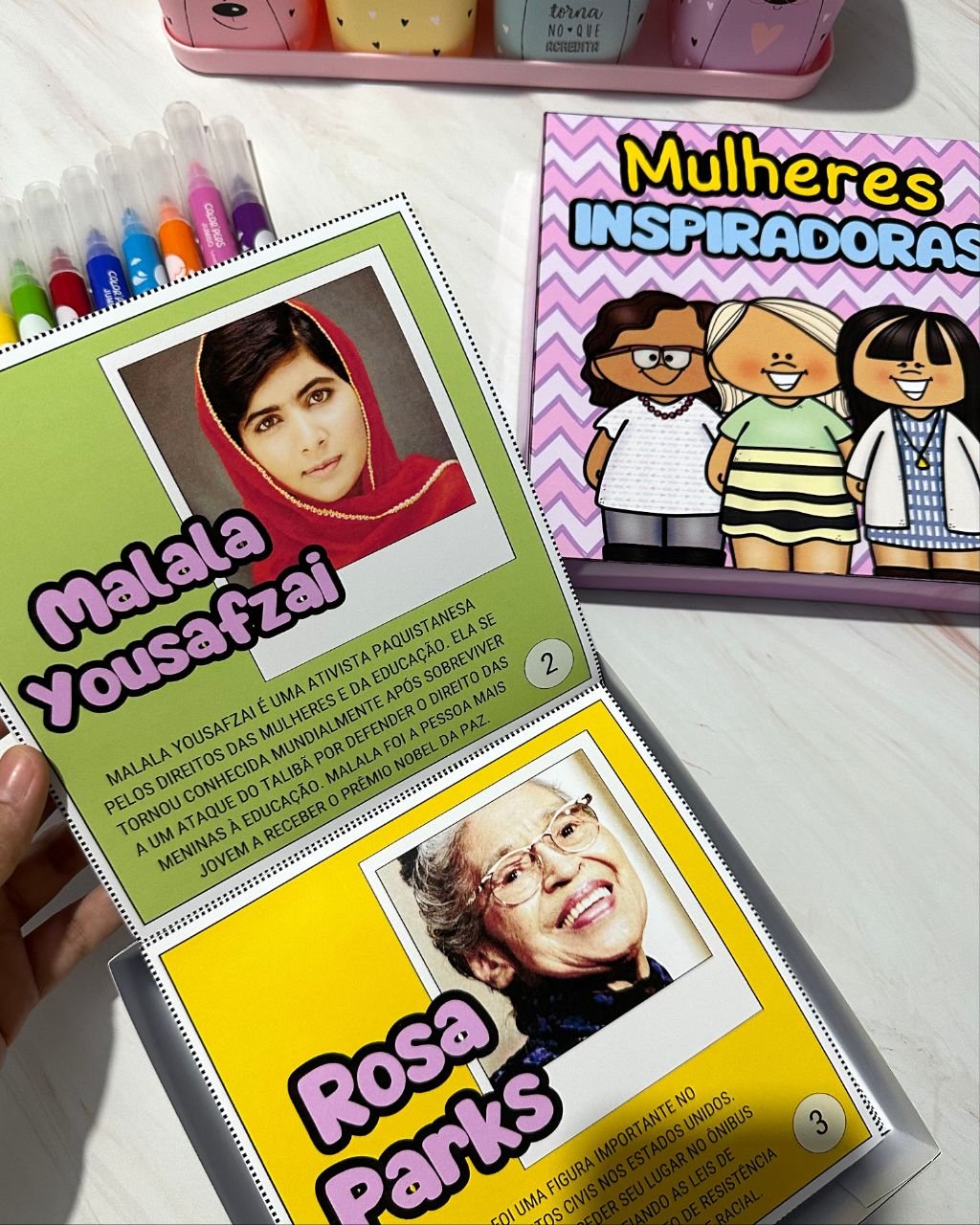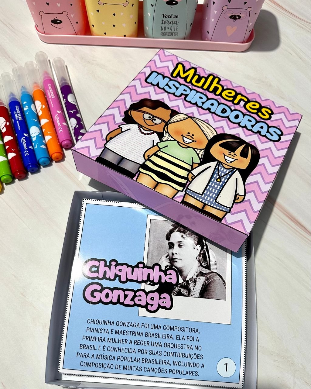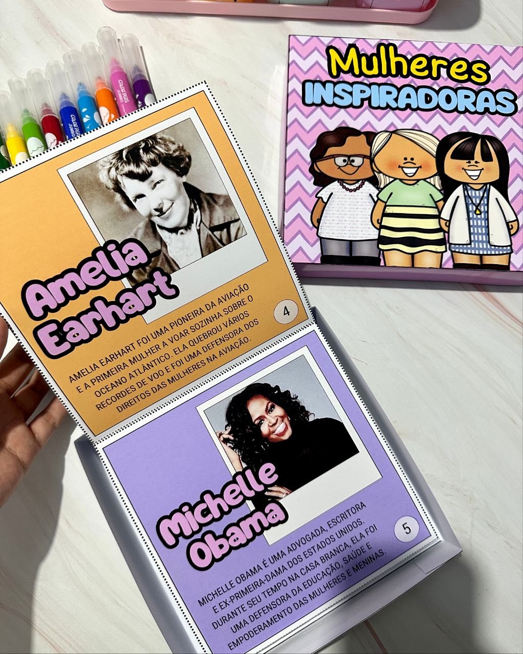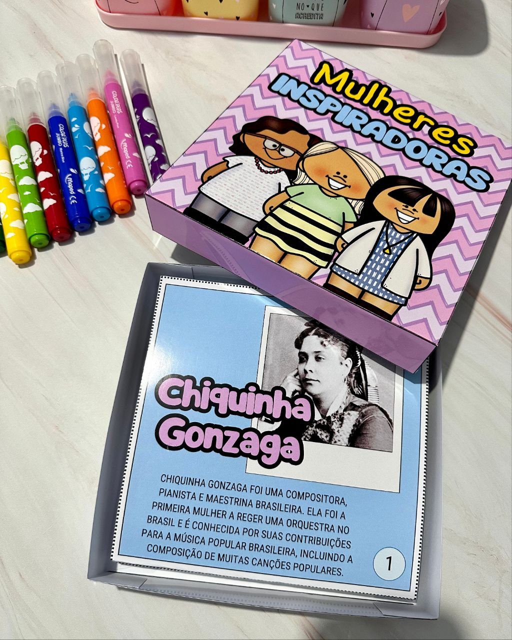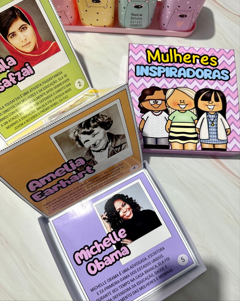 Esse material vai em formato de caixa e inclui a história de mulheres que foram