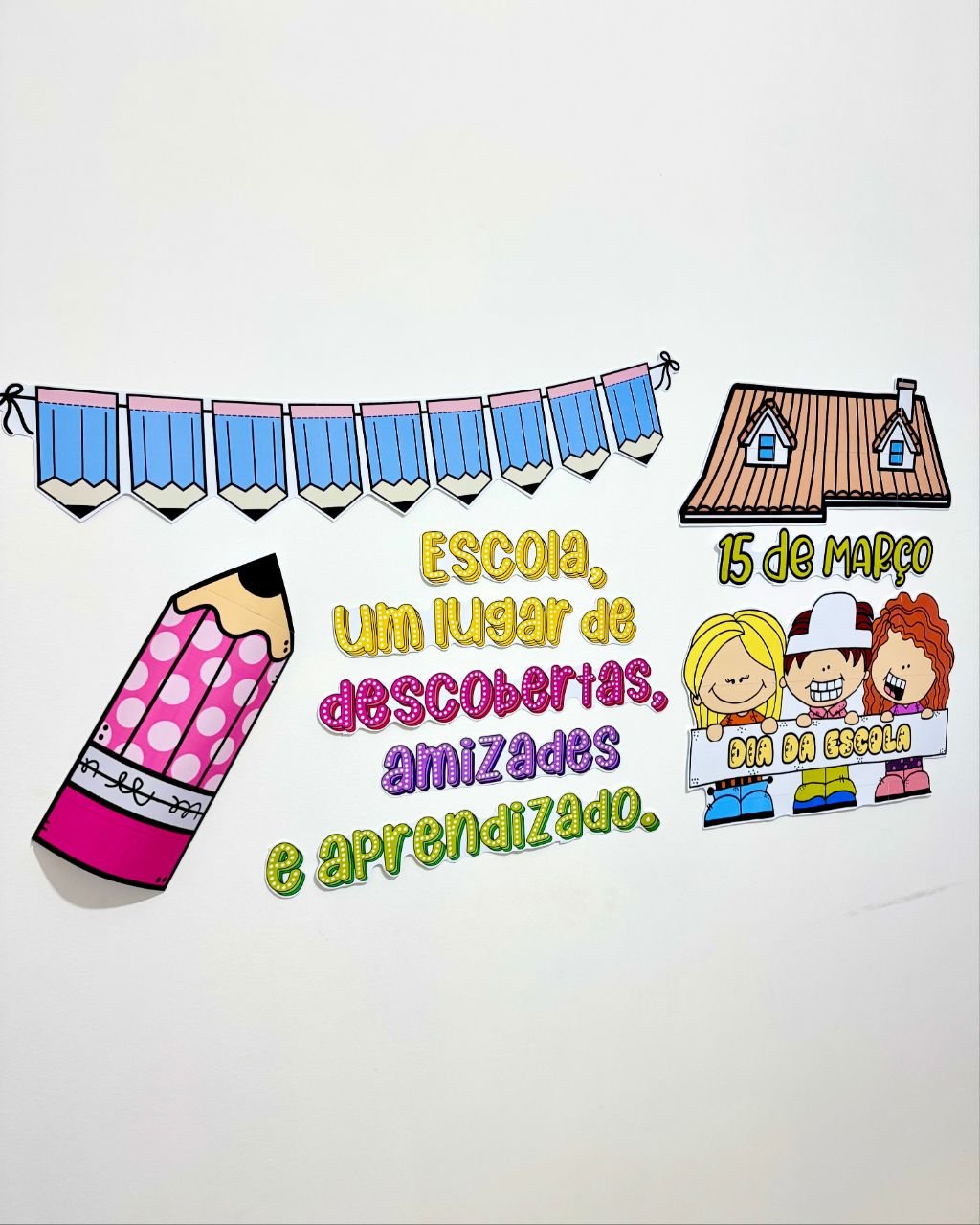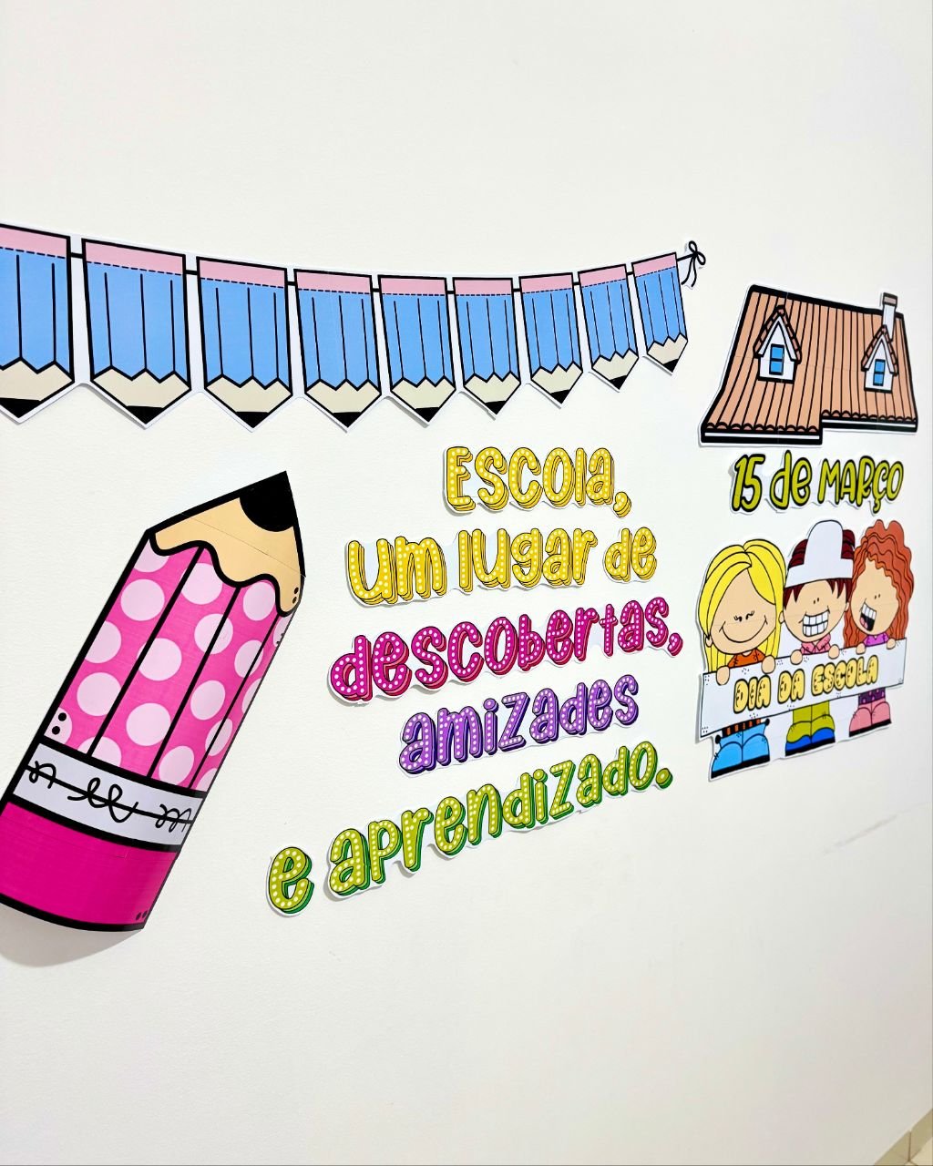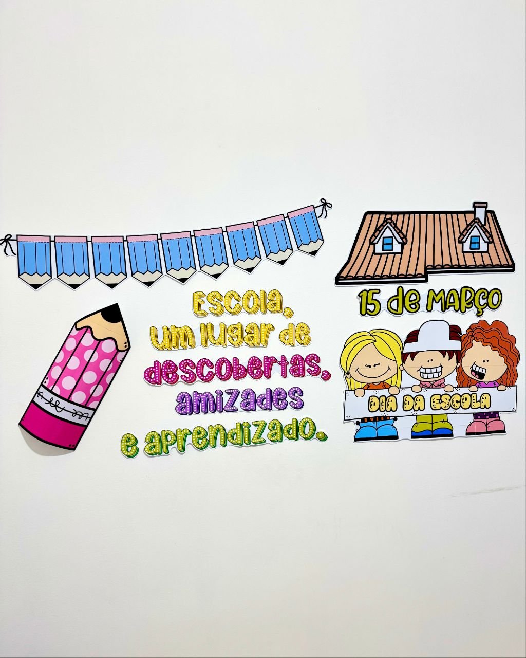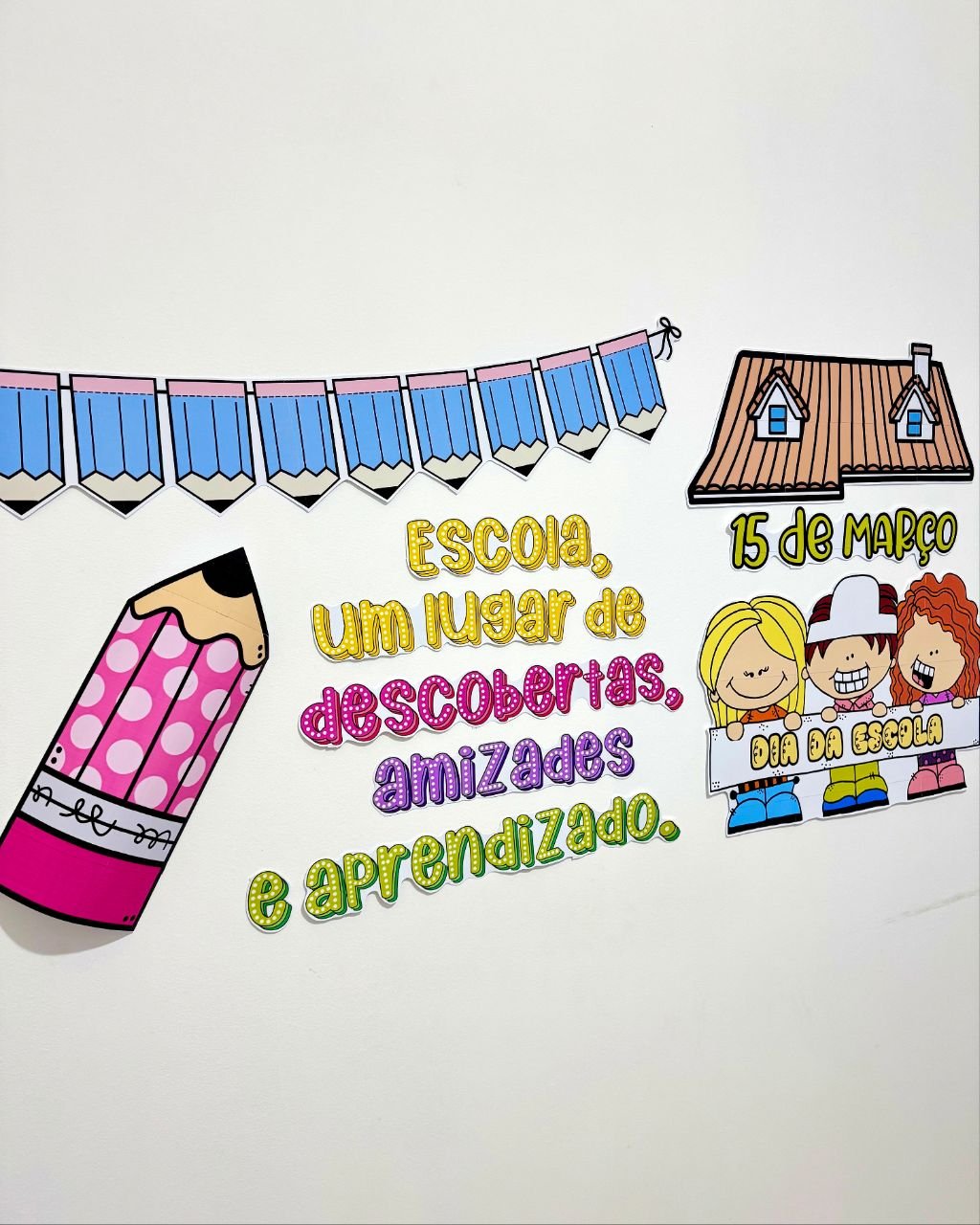 Painel tema Dia da Escola para turmas de Educação Infantil e séries iniciais do Ensino Fundamental.
