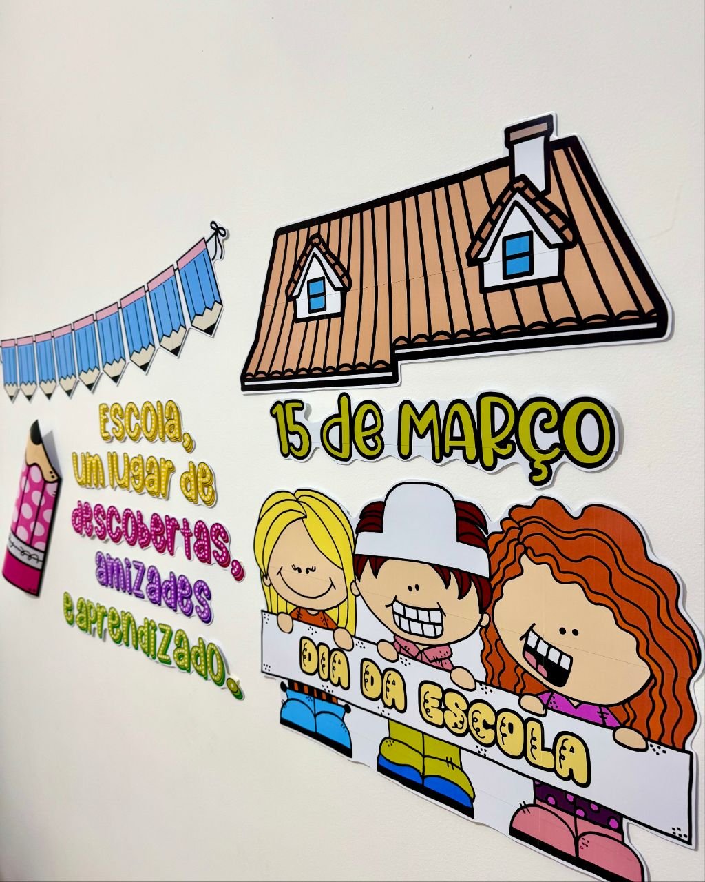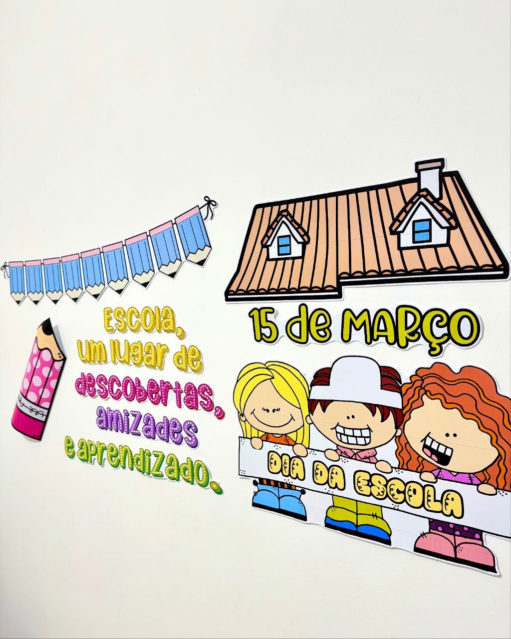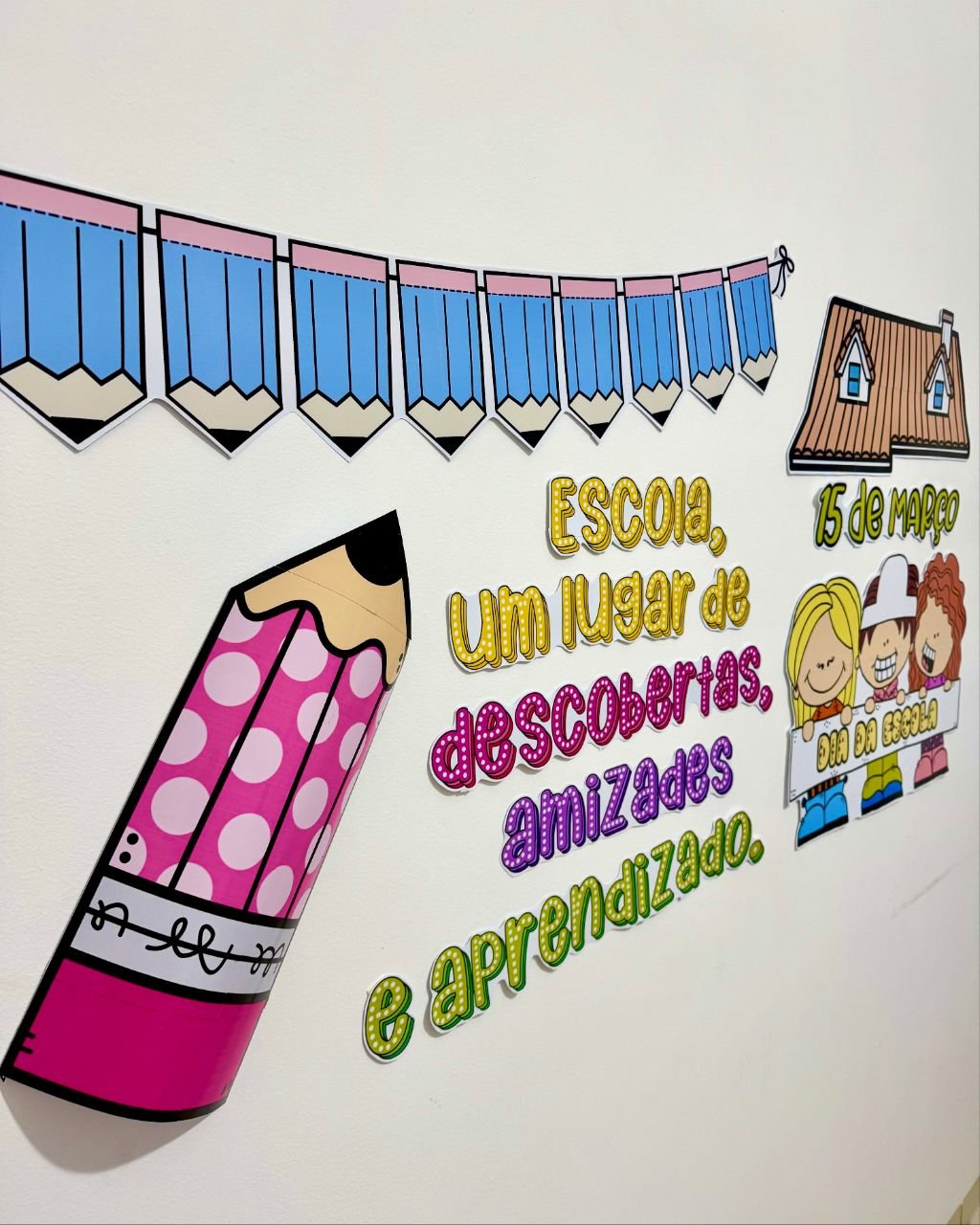 Painel tema Dia da Escola para turmas de Educação Infantil e séries iniciais do Ensino Fundamental.